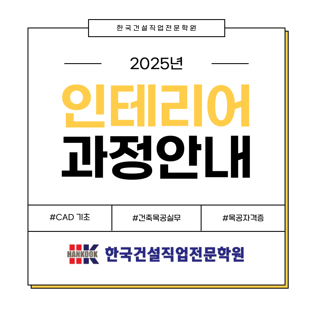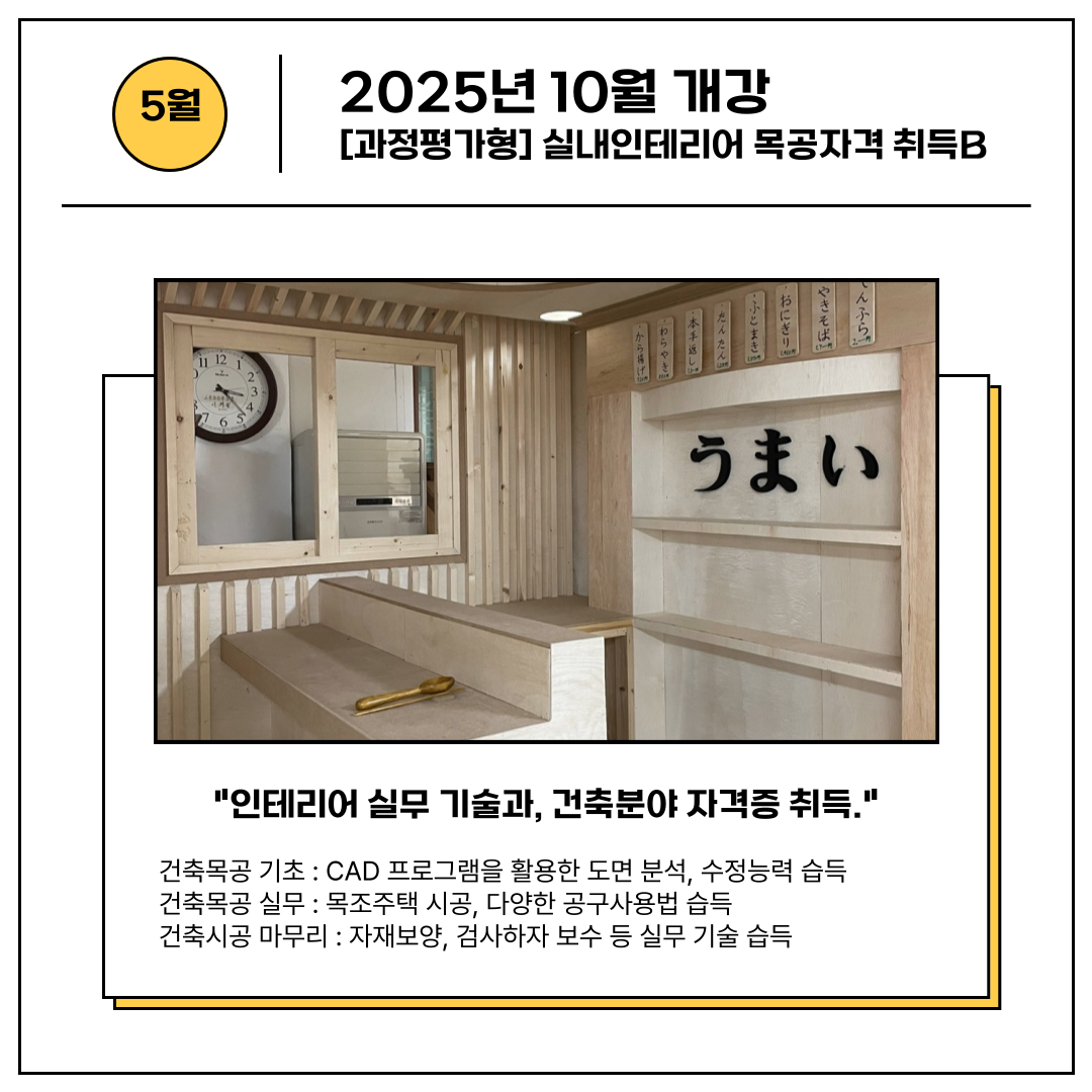 [공지] [안양캠퍼스 10월 개강과정] 실내인테리어시공실무를 위한 건축목공자격취득과정B 개강!2025.09.15 195 |