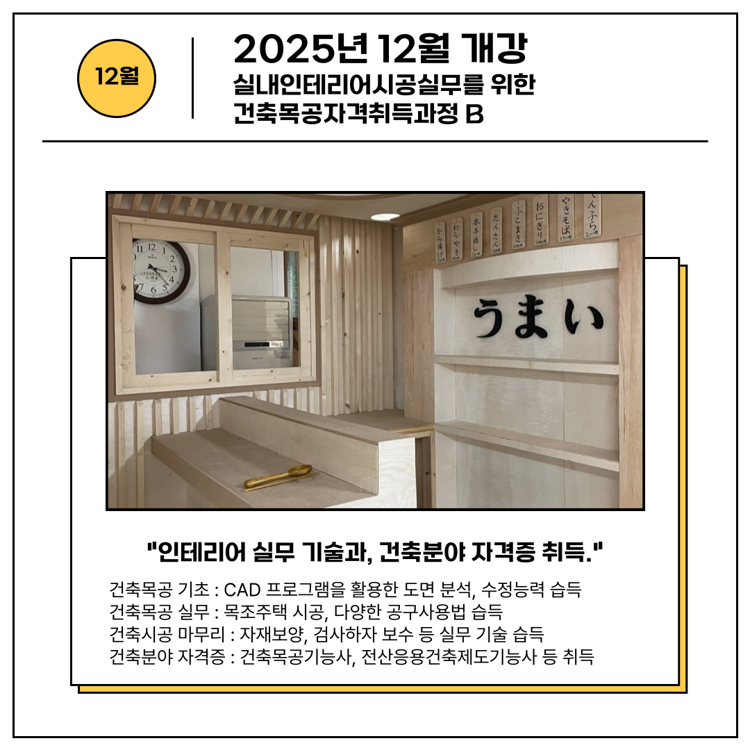 | 다음글 | 공지[안양캠퍼스 12월 개강과정] 과정평가형 건축목공산업기사 취득과정B |
