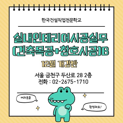 [공지] 독산본점 25년 12월개강!! 실내인테리어시공실무(건축목공+창호시공)B2025.11.05 39 |