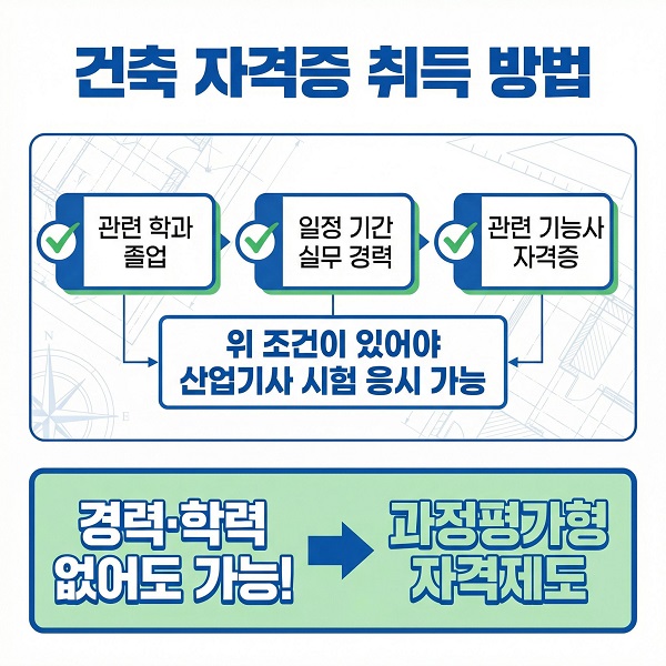 건축목공이라고 하면 많은 분들이 단순히 "나무 작업"을 떠올립니다. 하지만 실제 현장에서는 생각보다 훨씬 다양한 작업이 포함됩니다. 예를 들어 이런 작업들이 모두 건축목공 영역에 포함됩니다. 그리고 산업기사 자격은 단순 작업 능력뿐만 아니라 구조 이해 시공 과정 이해 도면 해석 능력 까지 함께 요구되는 중급 기술자격 입니다. 그래서 기능사보다 한 단계 높은 전문성을 요구하는 자격으로 분류 됩니다. 건축 관련 자격증 취득하려면 보통 다음과 같은 조건이 필요합니다. 관련 학과 졸업 일정 시간 이상의 실무 경력 관련 기능사 자격증 취득 이러한 응시 자격 조건이 있어야 산업기사 시험을 볼 수 있습니다. 하지만 모든 사람이 경력이나 학력 조건을 갖추고 있는 것은 아닙니다. 그래서 마련된 제도가 바로 과정평가형 자격 제도 입니다.